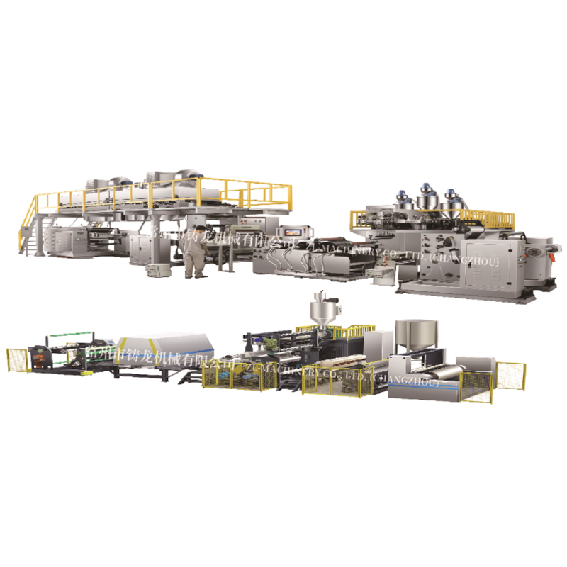 鑄龍ZLX-LM擠出淋膜復(fù)合機組系列,利用PE/EVA/PP/TPU/POE等熱塑材料的擠出工藝,對基材進行單/雙面覆膜或多層復(fù)合,形成具有多種功能的復(fù)合制品。該系列設(shè)備擁有多種模塊化結(jié)構(gòu),通過模塊組合,可以實現(xiàn)低速、中速、高速、超薄、超高克重淋膜復(fù)合功能,適用淋膜基材涵蓋薄膜、無紡布、珍珠棉、發(fā)泡卷材、紙、紡織品、編織布、針刺布、水刺布、網(wǎng)格布、功能隔膜、金屬箔、鍍鋁膜等。通過單機、雙機、多機以及單層/共擠、預(yù)熱、預(yù)涂、復(fù)合等功能選配,可以滿足食品、外包裝、裝飾品、建材、農(nóng)業(yè)、光電、車船航天功能材料等領(lǐng)域的廣泛需求。